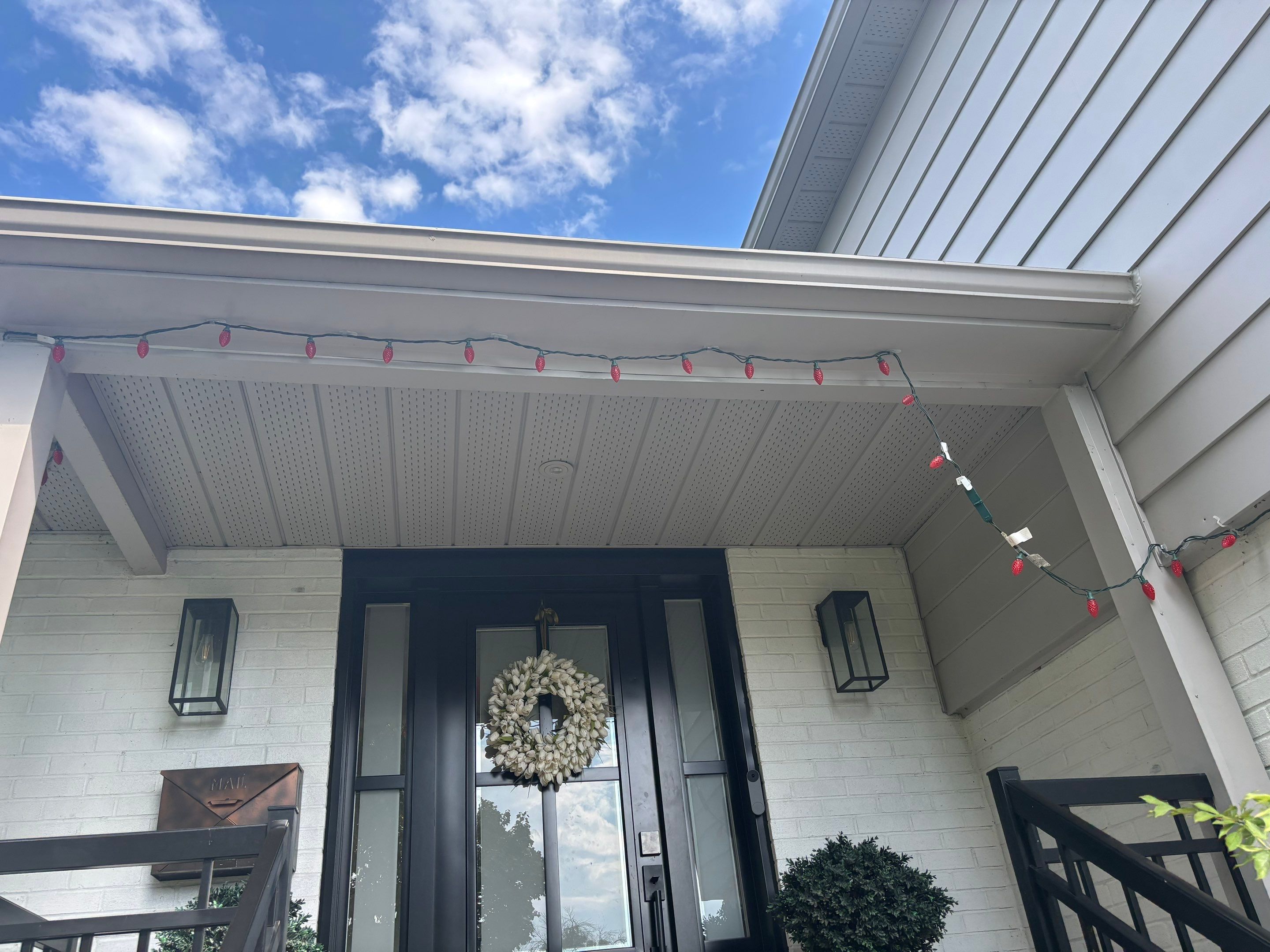 After talking through what the homeowner wanted, our team recommended Gemstone Lights — a system of permanent LED soffit lighting that gets installed once and stays in place forever. Small LED lights are mounted right into the eaves of the home. During the day, you can barely see them. At night, they can light up in any colour, any pattern, and any style you can think of.