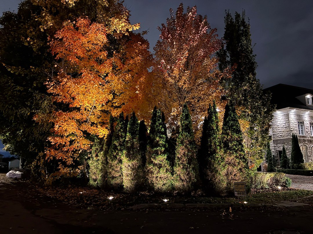 This landscape lighting installation in Laval (Sainte-Dorothee) upgraded an existing setup and added intentional lighting where the property needed it most: shrubs near the street and a darker zone deeper inside the property near the driveway.